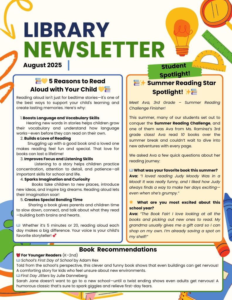 - For a student highlight: “Write a short feature for a school newsletter about a fictional student who completed the Summer Reading Challenge with short interview about their favorite book and what they are most looking forward to this year (book fair).”